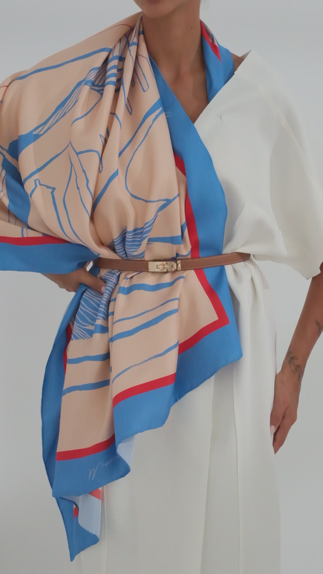 Dubai is a city where the sands of tradition meet the skyline of innovation, where each line drawn on this scarf echoes a story told by the desert winds. The dunes, like soft waves frozen in time, cradle the city’s ambitions, a reminder that amidst the bustling urbanity, nature’s serene embrace endures.