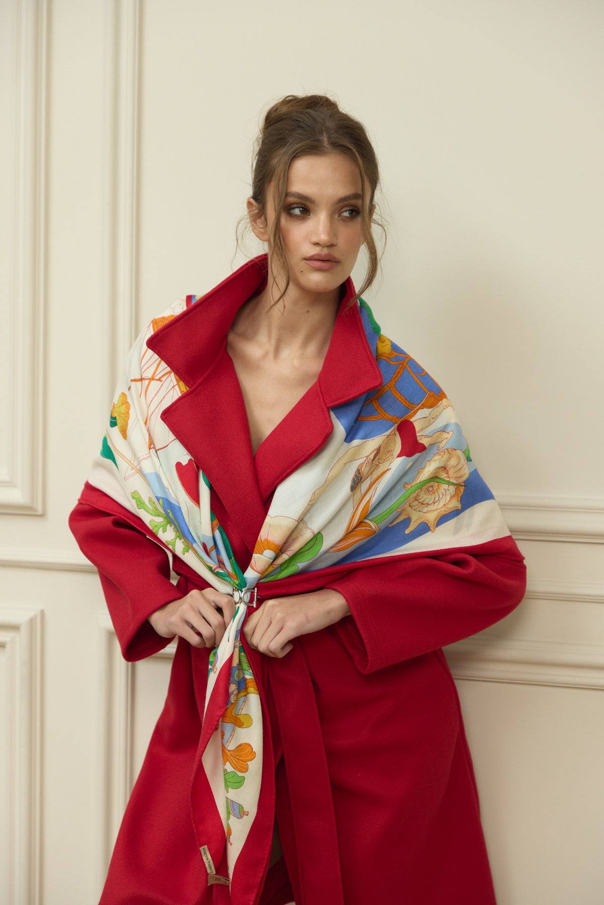 Shawl in cashmere and silk with hand-rolled edges and double-sided print (85% wool, 10% silk, 5% cashmere).